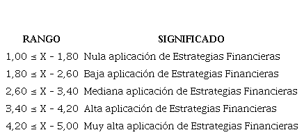En este punto, la complejidad de las decisiones estratégicas que debe asumir la gerencia, implica la escogencia del mejor escenario financiero posible. Por ello, aunque se logró evidenciar que se realizan esfuerzos por desarrollar adecuadamente los procesos de gestión empresarial y la formulación de la estrategia financiera, se debe enfatizar en análisis integrales que lleven inmersas estrategias acordes para hacer frente a las condiciones externas que afectan el desarrollo empresarial, dadas las fluctuaciones como consecuencia de diversos factores políticos, sociales y económicos, así como en la evaluación de las estrategias aplicadas.