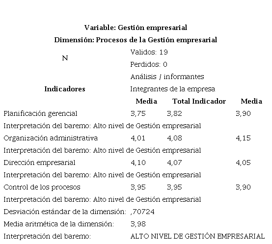 A continuación, se presentan los resultados obtenidos en la aplicación del instrumento. Para su presentación, se inició con la variable Gestión empresarial, con el objetivo de evidenciar el resumen de la dimensión “Procesos de Gestión empresarial” de la variable, a continuación, se muestra la Tabla 4, que engloba los indicadores evaluados: planificación gerencial, organización administrativa, dirección y control de los procesos.