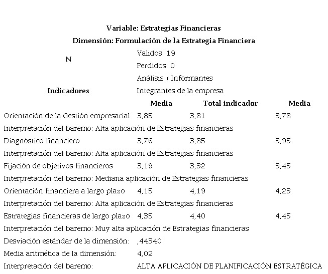 En la tabla 5 se observa que la media para la dimensión Formulación de la Estrategia financiera es de 4,02 y se ubica en la categoría Alta aplicación de Estrategias financieras. Teniendo en cuenta el orden de los indicadores, el indicador Orientación de la Gestión empresarial obtuvo un resultado de 3,81; Diagnóstico financiero 3,85, interpretándose para ambos una Alta aplicación de Estrategias financieras; continuando con el indicador Fijación de objetivos financieros, se situó en Mediana aplicación de Estrategias financieras con un promedio de 3,32; mientras que el indicador Orientación Financiera muestra un resultado de 4,19 y Estrategias financieras de largo plazo 4,40, ubicándose en la categoría de Alta y Muy alta aplicación de Estrategias financieras, respectivamente.