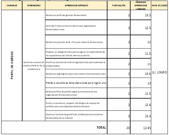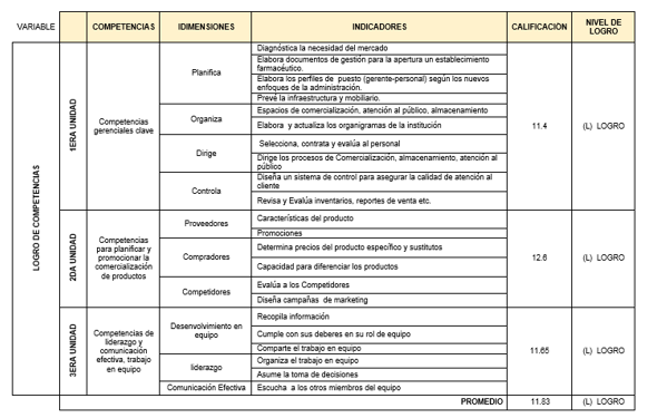 En la Tabla 6, se ha calificado el logro de las competencias por unidad didáctica de la asignatura de Administración Farmacéutica, evidenciándose que en las tres unidades el promedio de la calificación fue de 11.4, 12.6 y 11.65 respectivamente, lo que arroja un nivel de logro de 11.88, que llevado a la escala de valoración por niveles (Tabla 1) se estaría frente a LOGRO, es decir que se ha alcanzado niveles mínimos del logro esperado, frente a las posibilidades de llegar a un logro pleno o con excelencia.