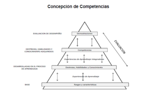 La pirámide, en el Gráfico 1, muestra como cada uno de los peldaños influencia a los que están arriba o debajo de él en una relación recíproca. En el primer peldaño se ubican rasgos y características, los cuales conforman la base de la estructura para el aprendizaje; alude a los aspectos innatos del ser humano a partir de los cuales se pueden edificar nuevas experiencias. En el segundo peldaño, se sitúan destrezas, habilidades y conocimiento, las cuales son desarrolladas durante el proceso de aprendizaje contextualizado.