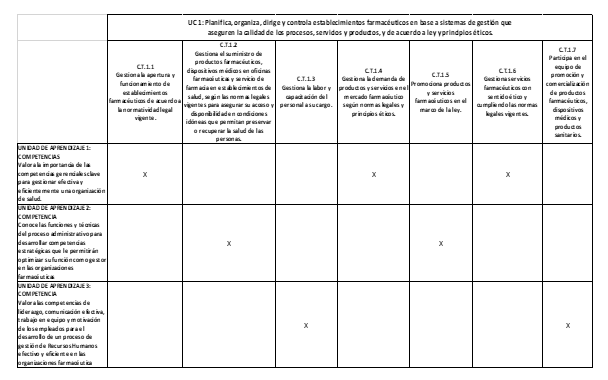 Este alineamiento permitió evidenciar que de las siete (7) competencias terminales planificadas en el programa, específicamente a la asignatura de Administración le corresponde desarrollar la unidad de competencia 1 UC1: Planifica, organiza, dirige y controla establecimientos farmacéuticos en base a sistemas de gestión que aseguren la calidad de los procesos, servicios y productos, y de acuerdo a ley y principios éticos, y para ello se debe alcanzar siete capacidades terminales. En el sílabo de la asignatura del año 2020 (Facultad de Farmacia y Bioquímica, 2020) se han planificado tres unidades didácticas (aprendizajes), que, al relacionarlas y alinearlas entre sí, muestran que la primera Unidad Didáctica permite el logro de las capacidades terminales CT1.1, CT1.4 y CT1.6. En esta unidad se desarrollan las competencias gerenciales clave: planificar, dirigir, organizar y controlar.