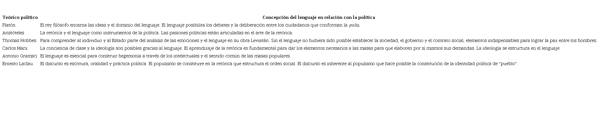 A manera de hoja de ruta en la Tabla 1 mostramos la concepción del lenguaje y la política de los pensadores mencionados en este apartado.