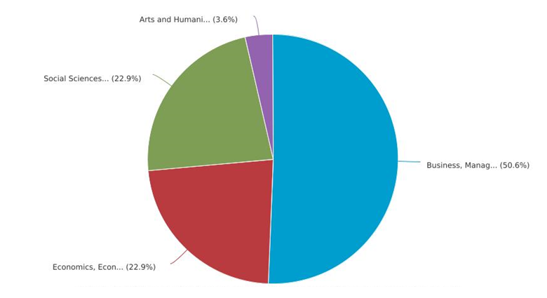 La base de datos Scopus clasifica la producción científica sobre el desempeño organizacional en varias áreas temáticas esenciales. La Figura 2 representa un diagrama de pastel que indica que el área o disciplina científica más relevante es la de Business, Management and Accounting con un 50.60% de los artículos publicados, seguido de Economics, Econometrics and Finance con un 22.90%; asimismo, el área Social Sciences con un 22.90% mientras que en cuarto lugar se encuentra Arts and Humanities con un 3.60%. Estas cuatro áreas representan el 100% de los artículos publicados.