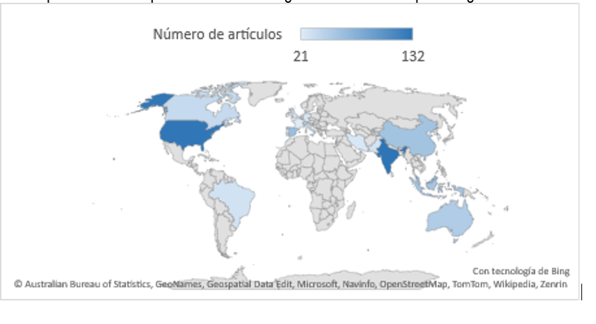En la Figura 4 se muestran los 20 países con mayor producción de artículos relacionados al Desempeño Organizacional en el periodo objeto de estudio. India y Estados Unidos lideran la producción científica con 132 y 130 artículos respectivamente mientras que en tercer puesto se ubica Malasia con 72. España se encuentra ubicada en la cuarta posición con 63 artículos seguido de China, Indonesia y Australia con 58, 57 y 50 artículos respectivamente. Un dato no menor a tener en cuenta es que existe un auge por investigar esta temática en los países de Medio Oriente. De esta manera, Emiratos Árabes Unidos, Jordania y Paquistán cuentan con 43, 29 y 28 publicaciones respectivamente. Por parte de América Latina, Brasil cuenta con 29 publicaciones, lo que le permite estar en la décima tercera posición por encima de países de primer mundo como son Alemania, Portugal, Corea del Sur y Francia.