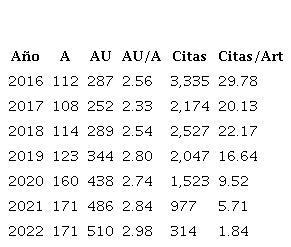 En la Tabla 2 y Figura 3 se muestra la evolución de la producción científica del término desempeño organizacional. Como se puede observar, la cantidad de artículos publicados se ha incrementado de forma progresiva en el periodo objeto de estudio, esto entre los años 2016 y 2022. En este sentido, se puede apreciar que tanto en el año 2021 como en el año 2022 se presentan la mayor cantidad de artículos publicados, esto es 171 investigaciones para cada año, seguido de 160 publicaciones realizadas en el año 2020; 123 manuscritos publicados en el 2019; 114, 108 y 112 estudios publicados en los años 2018, 2017 y 2016 respectivamente. Asimismo, se puede observar que el año 2022 presenta la mayor cantidad de autores que han realizado sus investigaciones en este campo del conocimiento, esto es 510 autores, seguido del año 2021 con 486 autores. En cuanto al número de citas, el año 2016 presenta el mayor número de trabajos referenciados con un total de 3,335 citas, seguido del año 2018 con 2,527. En tercer lugar, se ubica el año 2017 con 2,174 citas.