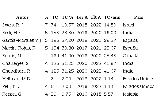 La Tabla 3 presenta los 10 autores que más investigaciones han realizado sobre Desempeño Organizacional. El autor con más producción es Sweis, R.J. de Israel, con 7 artículos en el periodo 2018-2020, quien, a pesar de lo reciente de sus publicaciones en este tema, muestra un buen nivel de citas (74), con lo cual alcanza un promedio de 10.57 citas por artículo y 14.8 citas por año. El más citado de los 10 autores es García-Morales, V.J., de España, con 186 citas en 5 artículos, lo que resulta un promedio de 37.20 citas por artículos, casi 3 veces el promedio de Sweis, R.J. A García-Morales lo siguen de cerca por un grupo de cinco autores Bontis con164 citas, Martín-Rojas con 154, Bedis con 133; Chatterjee y Chaudhuri con 125 citas. De este grupo, resaltan los autores: Chatterjee, S. y Chaudhuri, R., quienes con producción muy reciente (2020-2022) tiene similar número de citas que los otros cuatro mencionados, cuyas publicaciones se dieron entre el 2016 y el 2020. Chatterjee, S. y Chaudhuri, R., de India, son los autores con mayor producción promedio anual con 41.67 citas por año.