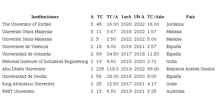 En lo que respecta a las instituciones más productivas sobre temas relacionados al Desempeño Organizacional, la Tabla 4 se muestran las 10 instituciones con más artículos publicados. Estas instituciones se encuentran concentradas mayoritariamente en universidades, instituciones reconocidas de investigación y productoras de estudios científicos en todas las materias.