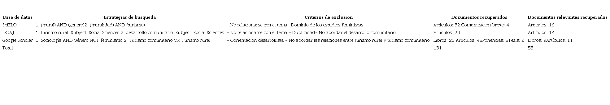 Se recuperaron 162 documentos de los cuales más de 50 fueron relevantes en correspondencia con el objetivo de la presente investigación. Fueron establecidas categorías y epistemas que facilitaron recuperar la información. En primer lugar, se localizaron los referentes sobre el turismo en espacios rurales y las categorías asociadas: 1) turismo rural, 2) turismo sustentable y 3) turismo desde el campesinado. La estrategia de búsqueda y el resto de los criterios de exclusión por fuente de búsqueda se muestra en la Tabla 1.