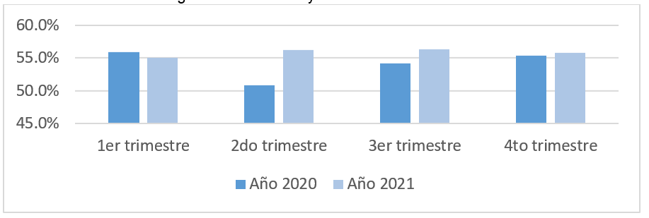 El año 2021 refleja incrementos de la informalidad en cada uno de los trimestres analizados, por lo que, si bien se deduce que ha habido recuperación del empleo, este ha sido de manera informal; pues se observa que no sólo se ha regresado a los niveles que existían antes de la pandemia, sino que la tasa de la informalidad se mantiene prácticamente igual (INEGI, 2021a; INEGI, 2021b; INEGI, 2021c; INEGI, 2022b).