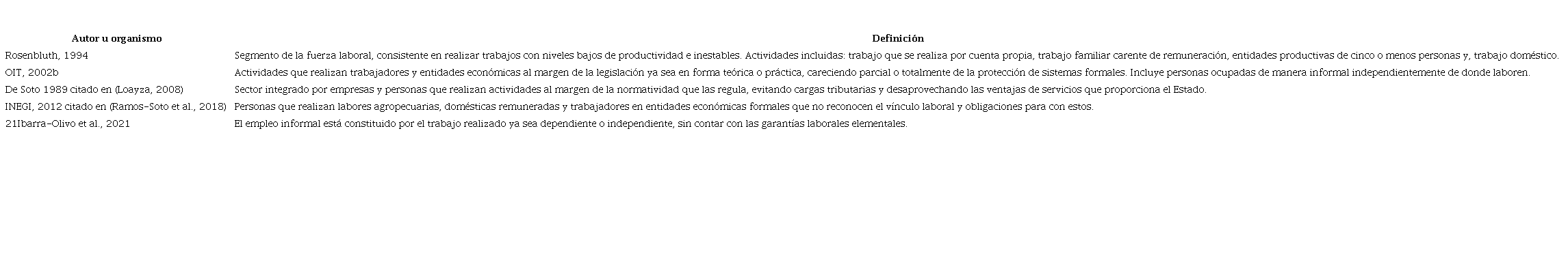 Por tanto, ese segmento de la población que comúnmente percibe salarios bajos -acentuando la desigualdad salarial- no cuenta con la posibilidad de acceder a los sistemas de seguridad social, lo cual incrementa gradualmente la pobreza multidimensional en el país (Varela y Nava, 2020). Ahora bien, a través del tiempo, la informalidad laboral ha sido conceptualizada por distintos autores y organismos, algunos de los cuales se describen en la tabla 1.