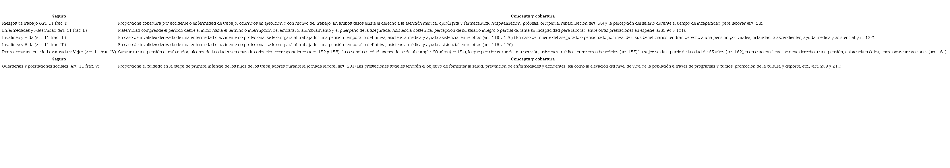 Ambas instituciones fueron constituidas con fundamento en el artículo 123 constitucional, en el apartado A el IMSS y en el apartado B el ISSSTE (CPEUM, 2021), señalándose los distintos ramos de seguros destinados a proteger a los trabajadores afiliados por sus patrones o empleadores; además de extender esa protección a los familiares de cada trabajador, cumpliendo con las características dispuestas para ello. Los ramos de seguros y su cobertura se describen en la tabla 2, tomando como referencia para efectos de esta investigación las contenidas en la LSS.