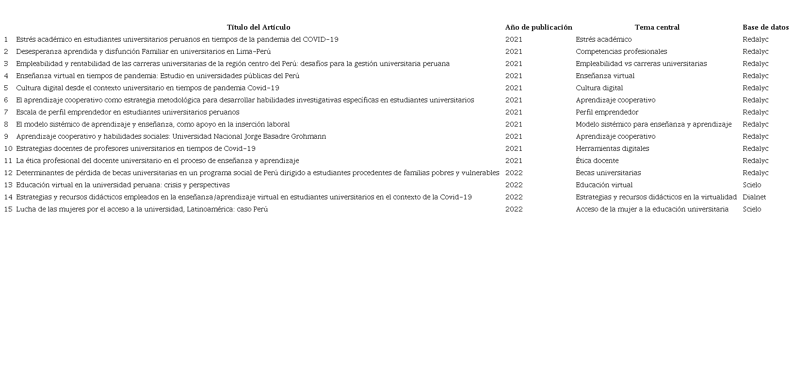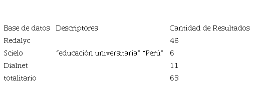 La búsqueda de información se estableció a partir del control sanitario de la pandemia COVID-19, vale decir aquellas publicaciones encontradas desde el 2021 al 2023. El proceso de indagación se llevó a cabo entre febrero y marzo de 2023. Las bases de datos empleadas para la búsqueda fueron: Scielo, Dialnet y Redalyc, siendo los descriptores guías de la indagatoria: “educación universitaria” +“Perú”, términos que permitieran mostrar investigaciones solo en la educación superior universitaria del Perú, los cuales se usaron de manera combinada. En la Tabla 1, se muestran los resultados encontrados para cada base de datos consultada.
