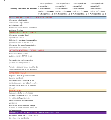 Como parte del proceso analítico cualitativo, se establecieron 6 ejes temáticos y 16 subtemas en forma de preguntas, organizando la información recopilada en la matriz analítica que aparece en el siguiente cuadro: