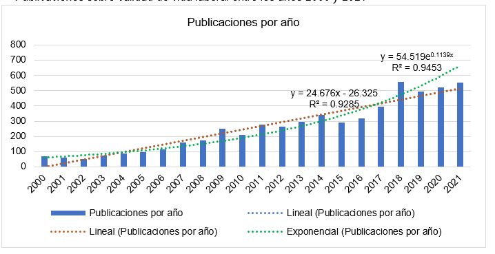 Al analizar la producción científica en la base de datos, los resultados de la búsqueda evidencian que existe interés en la temática investigada sobre calidad de vida laboral, que se puede observar en la Gráfica 1, que muestra una tendencia significativa de crecimiento exponencial con un R² = 0.9333 del año 2000 al 2021.