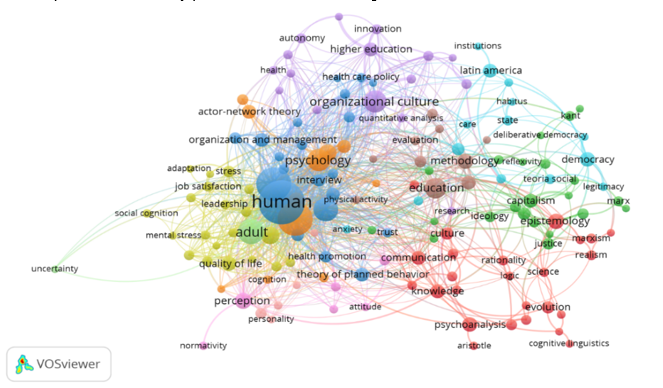 Con la finalidad de identificar tendencias y posibles áreas de investigación, en la Figura 2, se presentan 11 clústeres donde es posible observar la dinámica de las palabras clave – keywords, con los campos crecientes y emergentes relacionadas con la temática de calidad de vida laboral, a través del método de conteo fractional counting, considerando cinco veces el número mínimo de ocurrencia de cada palabra y, como método de normalización association strength.