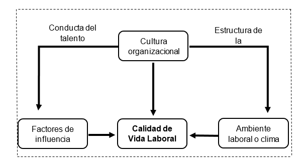 En tal sentido, la cultura organizacional y su impacto en la calidad de vida laboral pretende conocer como la academia aborda, interpreta y plantea este constructo de tal manera que permita tener un acercamiento a lo que esta aporta a los individuos que conforman las organizaciones, entonces desde esta perspectiva surge la siguiente interrogante ¿Cuáles son los factores o componentes principales que determinan la calidad de vida laboral? Pues de no dar una explicación concreta el termino pudiera ser muy ambiguo, para ellos diversos autores define que la calidad de vida laboral como aquellos factores que provocan y producen un bienestar a las personas, en cambio, la expresión calidad de vida laboral tuvo origen en una serie de conferencias patrocinadas al final de los años sesenta y comienzos de los años setenta promovidos por el Ministerio de Trabajo de los EE.UU. y la Fundación FORD, para hacer frente a los movimientos obreros que comenzaron a revelarse a los tratos desiguales que recibían de las empresas y frente a la deshumanización de las relaciones laborales (Castellano & López, 2021) así la calidad laboral va mucho más allá de los salarios competitivos, ya que implica una serie de factores adicionales. Entre ellos se encuentran contar con espacios laborales adecuados, recibir estímulos de reconocimiento, ser aceptado por la sociedad, construir una identidad y sentido de pertenencia, y tener la posibilidad de obtener reconocimiento y satisfacción a nivel social. Según Becerra (2015), quien cita a la Organización Internacional del Trabajo (2012), el trabajo constituye una fuente de dignidad personal, estabilidad familiar, paz en la comunidad, democracias que trabajan en beneficio de todos y crecimiento económico. Asimismo, se destaca su vínculo con el concepto de calidad de vida laboral, promoviendo oportunidades para un trabajo productivo y el desarrollo de las empresas.