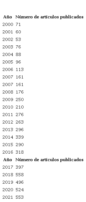 En la Tabla 1, se pueden observar los resultados del indicador bibliométrico de cantidad que refleja los datos de producción científica por año, relacionados con la temática de calidad de vida laboral, en la que se puede apreciar que se mantiene el interés de la comunidad científica por dicha temática durante los últimos veinte años del 2000 al 2021, con 5,664 documentos publicados, entre ellos 4,501 artículos científicos de los cuales con la ecuación de búsqueda limitada a la literatura de artículos científicos con acceso abierto, se obtuvo un resultado de 2,481 documentos científicos. El análisis refleja que, al momento de realizar este estudio a octubre de 2022, se han publicado 350 documentos.