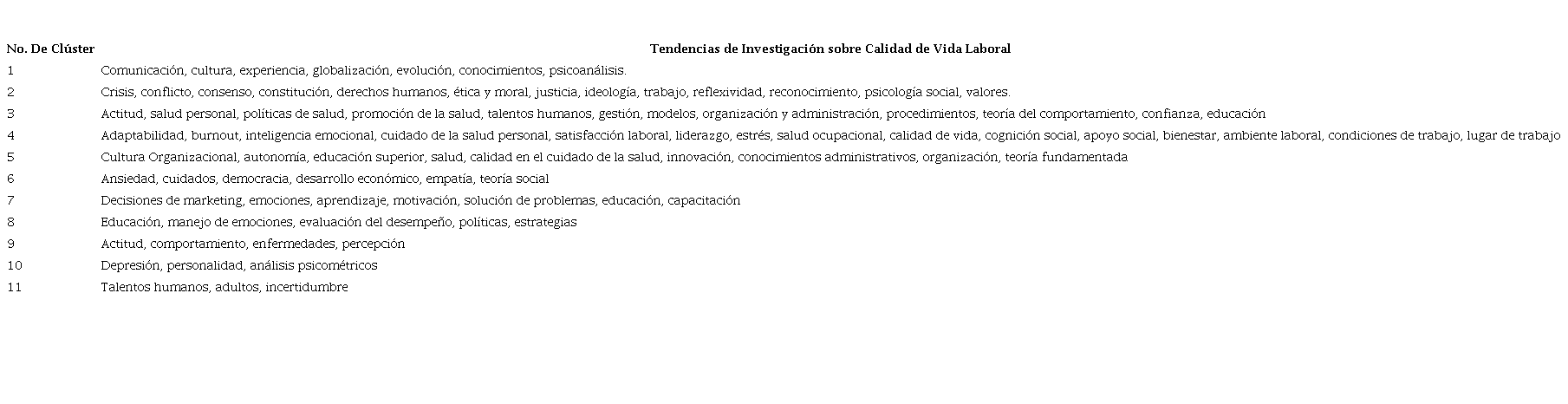 En el Cuadro 1, se muestran los diferentes clústeres con los temas de investigación relacionados al tema de calidad de vida laboral en cada uno de ellos, con base en las palabras clave asociadas en los estudios publicados. En este análisis se aprecian las principales tendencias de investigación por cada clúster, a través del método de conteo fractional counting, considerando cinco veces el número mínimo de ocurrencia de cada palabra y, como método de normalización association strength.