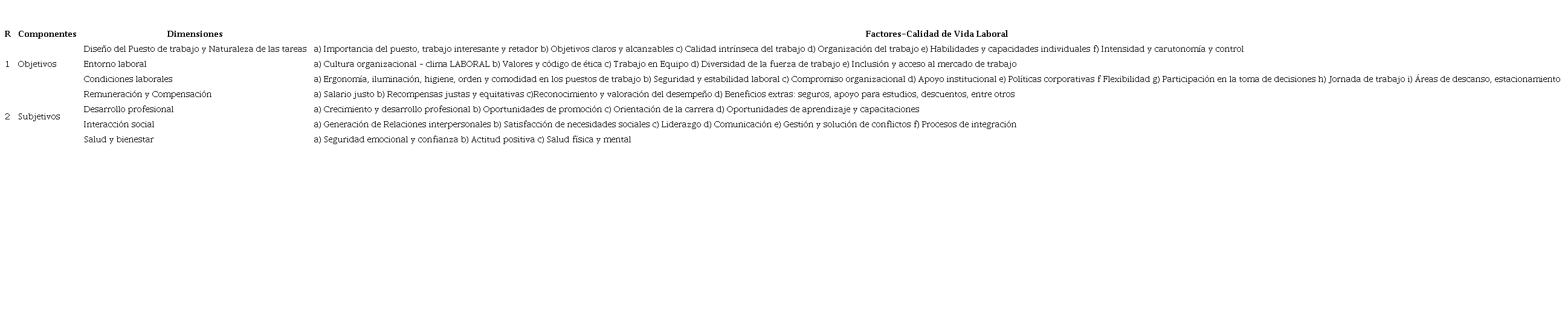 En el Cuadro 2, se identifican los componentes, las dimensiones y los factores que influyen en la calidad de vida laboral con base en la revisión sistemática de literatura.