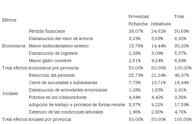 La tabla 1, muestra los principales efectos económicos y sociales que afectaron la situación financiera de las empresas dentro del sector manufacturero textil producto de la Covid-19, información que fue segmentada y clasificada por provincia (Pichincha e Imbabura). Los resultados señalan que la pérdida financiera fue el principal efecto económico que se manifestó producto de la pandemia de la Covid-19 con un 50,69%. Este resultado se relaciona con las considerables pérdidas que afrontaron las empresas a nivel nacional a causa de la paralización de sus actividades, debido a las medidas sanitarias de prevención de contagio y aislamiento que afectaron al normal funcionamiento de las operaciones organizacionales. El endeudamiento externo también figura como uno de los mayores efectos que obtuvieron las organizaciones con un 30,20%. Este resultado resalta la necesidad que tuvieron las empresas de recurrir a financiamiento externo para cubrir erogaciones operacionales y financieras, donde la prioridad fue cubrir gastos de nómina, costos de producción, gastos bancarios, gastos tributarios y gastos del seguro social. Al no tener operaciones regulares que duraron inclusive 18 meses posteriores al inicio de la pandemia, esto provocó sobreendeudamiento en el sector manufacturero textil.