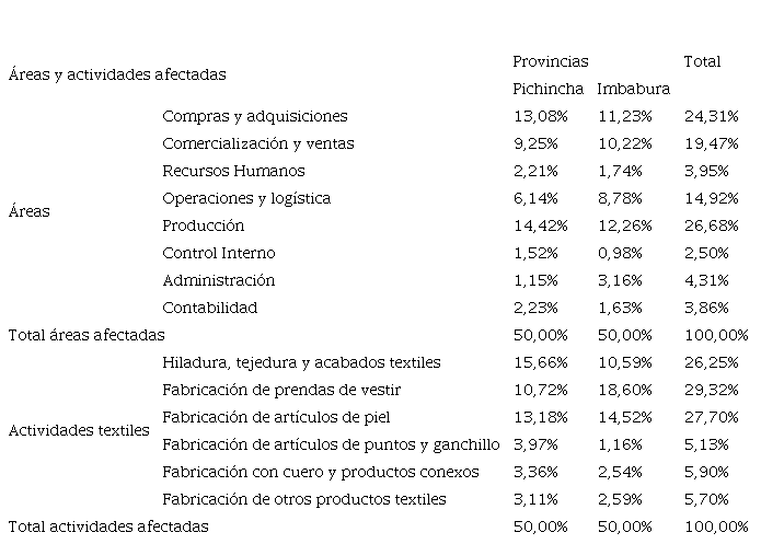 del sector manufacturero textil producto de la Covid-19 dentro de las provincias de Pichincha e Imbabura, donde el área de Producción con una puntuación del 26,68% resultó la más afectada. Así también, el área de Compras y adquisiciones obtuvo una puntación del 24,31%, seguida de la unidad de comercialización y ventas con un 19,47%; la afectación de estas áreas de vital importancia organizacional derivó en las siguientes consecuencias: