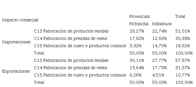 La tabla 3, muestra el principal impacto que se originaron en las actividades comerciales de importación y exportación de productos dentro del sector manufacturero textil producto de la Covid-19, los valores son presentados por provincia (Pichincha e Imbabura), según la Clasi¬ficación Industrial Internacional Uniforme – CIIU. La actividad con mayor impacto fue la fabricación de productos textiles (C13 – CIIU), esto desencadenó que disminuyan sustancialmente las exportaciones a causa de las restricciones de comercio exterior impuestas por los entes reguladores en pandemia y la condicionada producción interna que se generó. Las importaciones de materia prima para desarrollar sus actividades tuvieron un declive a causa de la paralización de procesos productivos, lo que ocasionó menores niveles de productividad y comercialización, por ende, la poca demanda de insumos para la transformación.
