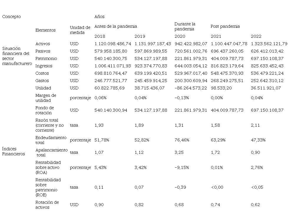 En el contexto de la crisis originada por la pandemia de la Covid-19, la situación financiera de las empresas del sector manufacturero a nivel global ha sido deficiente, donde los cambios más significativos en su estructura financiera se presentaron debido a la disminución de activos, aumento de obligaciones, reducción del patrimonio, aumento de gastos corrientes, pérdidas financieras y reducción de utilidades a gran escala (Mehta et al., 2022). A esto se debe añadir, la reducción de los niveles de inversión en bienes de capital, la ineficiente gestión de costos de producción, el uso limitado y restringido de mano de obra calificada, lo que implicó una situación financiera negativa dentro del sector manufacturero producto de la pandemia (Jiménez y Narvaez, 2021; Flores et al., 2018).