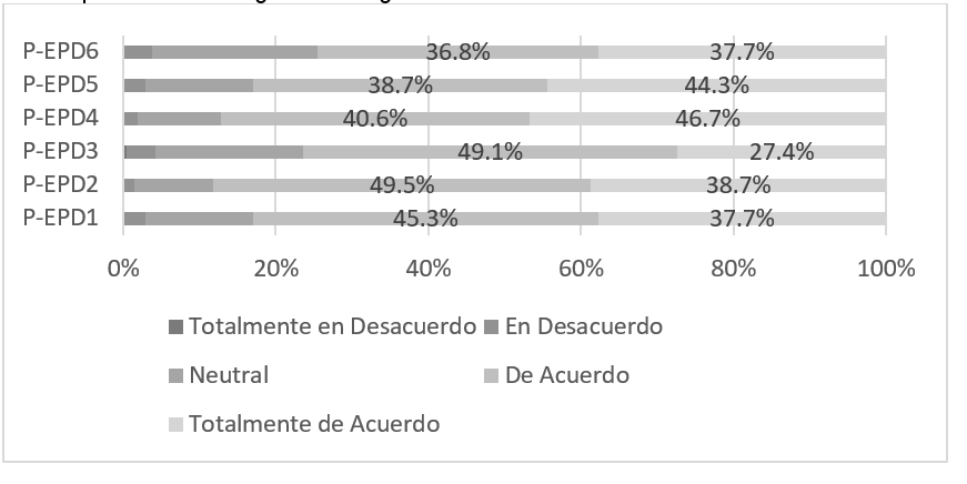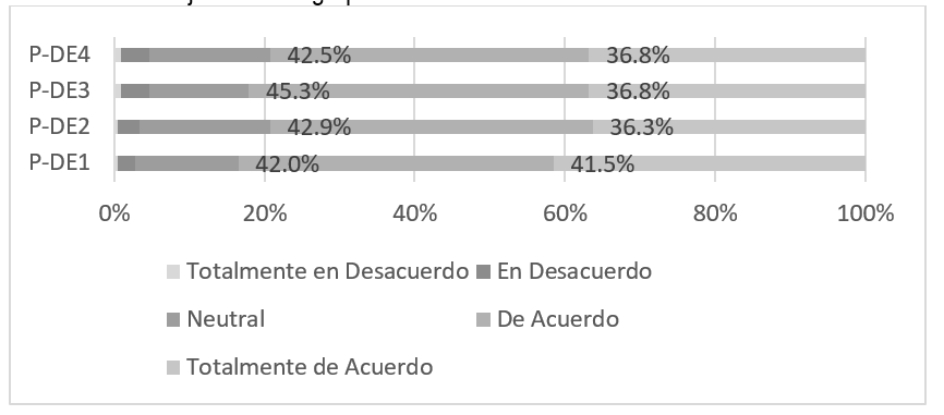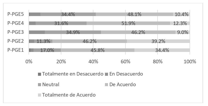 En el caso de la dimensión: “Privilegio de Grupo Externo”, que mide la percepción de la desigualdad de género en términos de los privilegios percibidos en el grupo externo; las respuestas de las participantes indicaron que su percepción es la dimensión que efectivamente los hombres han tenido oportunidades, privilegios, ventajas y trato preferencial basado en una cuestión de género, y varían tomando en cuenta las opiniones afirmativas (“de acuerdo” y “totalmente de acuerdo”) de los ítems P-PGE· (55.2%) al 85,4%, del ítem P-PGE2, tal como se observa en la Figura 2.
