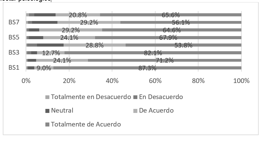 En el caso de la dimensión de “Bienestar Psicológico: La media y la mediana de cada ítem están cercanos, lo que indica que la distribución de los datos es simétrica. El promedio (media) de la escala de bienestar psicológico subjetivo es de 4,54, lo que sugiere que en promedio las mujeres migrantes venezolanas reportan un bienestar psicológico subjetivo moderado a alto. No obstante, se observó cierta variabilidad en las respuestas, ya que el rango de las puntuaciones va desde 1 a 5 además que el valor de la desviación estándar, que mide la variabilidad de los datos con respecto a la media, es relativamente alto, oscilando entre 0,67 y 0,91. En referencia a la forma de la distribución, se observó que para todos los ítems hay una asimetría negativa, lo que significa que la mayoría de las respuestas se concentran hacia el extremo superior de la escala -las mujeres migrantes venezolanas reportan un bienestar psicológico subjetivo relativamente alto-.