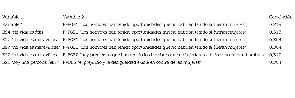 Los ítems que componen la variable “Bienestar Psicológico” se encuentran moderadamente correlacionadas con la dimensión “Privilegio de Grupo Externo” y “Desventaja del Endogrupo” y en menor medida con la dimensión “Experiencia pasada con desigualdad de género” y no se hallaron correlaciones con la dimensión “Percepción en contexto”, solo se indican las correlaciones superiores con valores en el rango de 0,3 a 0,5, la cuales son consideradas moderadas. A pesar que la dimensión “Bienestar Psicológico subjetivo”, no esté directamente relacionado con la desigualdad de género, los resultados del test de Correlación sugieren algún tipo de interrelación en la percepción de los participantes sobre esta problemática. La dimensión de "Bienestar Psicológico Subjetivo" puede estar influyendo en la percepción de los participantes sobre la desigualdad de género de manera indirecta, lo que sugiere la importancia de abordar el bienestar emocional y la capacidad de afrontamiento ante situaciones estresantes en los esfuerzos por reducir la desigualdad de género