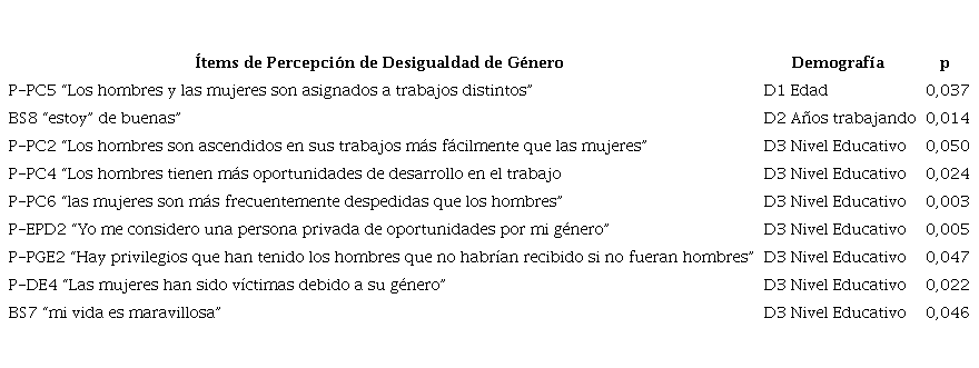 El análisis de la asociación entre ítems mediante el Test de Chi-cuadrado indicó asociaciones significativas entre las variables Demografía y Percepción de desigualdad de género. Existe una asociación significativa entre la Edad y el ítem P-PC5 “Los hombres y las mujeres son asignados a trabajos distintos”, entre el ítem “años trabajando” y BS8, “estoy de buenas”. La mayor cantidad de asociaciones significativas, entre ítems sucedió con el ítem D3 “Nivel educativo” y los ítems: P-PC2 “Los hombres son ascendidos en sus trabajos más fácilmente que las mujeres”; P-PC4 “Los hombres tienen más oportunidades de desarrollo en el trabajo”; P-PC6 “las mujeres son más frecuentemente despedidas que los hombres”; P-EPD2 “Yo me considero una persona privada de oportunidades por mi género”; P-PGE2 “Hay privilegios que han tenido los hombres que no habrían recibido si no fueran hombres”; P-DE4 “Las mujeres han sido víctimas debido a su género”; y BS7 “mi vida es maravillosa”. Estos resultados sugieren la existencia de asociación importante entre la “Percepción de la desigualdad” y el Nivel educativo de las participantes.
