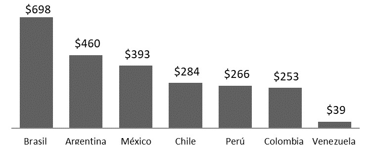Para mostrar la importancia de los restaurantes en la economía latinoamericana, retomamos el trabajo de Aaron Allen & Associates que señala que, en 2020, la industria restaurantera de siete países: Brasil, Argentina, México, Chile, Perú, Colombia y Venezuela, representaba un total de 250 mil millones de dólares. El gasto per cápita en restaurantes es variable en los distintos países de la región y desde luego ha cambiado en el tiempo. Brasil fue el país con el nivel de gasto más alto, con un promedio 698 dólares anuales, le siguen Argentina y México. En contraparte Venezuela tenía el gasto más bajo que es de 39 dólares anuales (Aaron Allen & Associates, 2022). La siguiente gráfica da cuenta del gasto per cápita anual en restaurantes de los habitantes de los siete países citados.