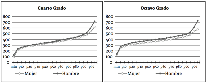 La gráfica 1 describe la distribución del desempeño de los estudiantes de los grados cuarto y octavo; es clara la hegemonía de los chicos en todos los puntos de la distribución, no obstante los de cuarto grado presentan una brecha más ajustada en el 50% inferior de los puntajes, de ahí en adelante, a medida que mejoran los puntajes las diferencias se van haciendo más amplias. En octavo grado la tendencia es más clara, la brecha en los puntajes entre chicos y chicas está claramente definida desde los puntos más bajos aumentando según incrementa el desempeño de los estudiantes.