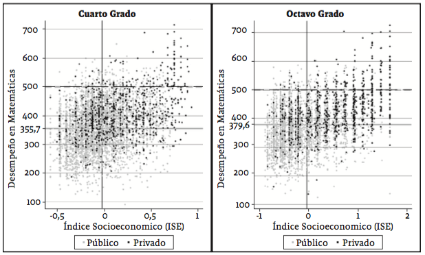 Los diagramas de puntos de la gráfica 2 permiten evaluar la relación entre el desempeño académico y el nivel socioeconómico de los estudiantes controlado por el tipo de institución pública-privada. En los diagramas, la línea horizontal punteada representa el promedio de los países de la Organización para la Cooperación y el Desarrollo Económico (OECD por su sigla en inglés) (500 puntos) y la línea continua, el promedio para Colombia (355,7 puntos en cuarto grado y 379,6 puntos en octavo); la línea vertical representa la valor medio del nivel socioeconómico que en ambos casos se encuentra por debajo del valor cero. Además, los puntos de color negros en los diagramas representan los puntajes de los estudiantes pertenecientes a los colegios privados, mientras que los de color gris están asociados con los colegios públicos.