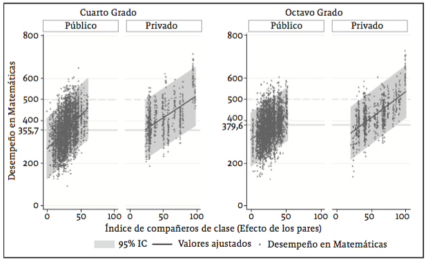Al evaluar la relación entre el desempeño en matemáticas y el efecto de los pares en la clase por tipo de colegio (gráfica 3) se observa una partición producto de la interacción de las variables. El efecto de los pares segmenta los puntos colocando en la parte baja de la distribución a los colegios públicos –nube de puntos gris con valores por debajo de 60 puntos en el eje horizontal, tanto en cuarto como en octavo–, mientras que en los colegios privados, los puntos se concentran en la parte alta de la distribución. Dado que la variable efecto de los pares es utilizada como una proxy del capital social de los estudiantes, la gráfica 3 muestra que a medida que el efecto de los pares o el capital social se incrementa, el desempeño académico de los estudiantes se incrementa a tasas bastante altas, producto de la alta inclinación de la recta.