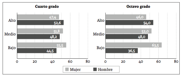 Al evaluar las brechas entre los promedios de desempeño entre niños y niñas, se observa que en los colegios oficiales es de 13,3 puntos en cuarto grado, y que en octavo asciende a 29 puntos, en promedio. En los colegios privados, la brecha tiende a ser constante, pero ya en cuarto grado se evidencia un amplio diferencial a favor de los niños (30,5 y 35,1 puntos en cuarto y octavo respectivamente); este resultado hace pensar que en los colegios privados la construcción de autoconceptos en matemáticas por parte de los estudiantes se presenta a más temprana edad, o que en promedio la institución le permite al estudiante identificar a más temprana edad las áreas de mayor fortaleza.