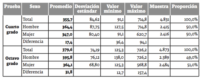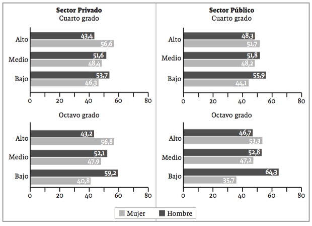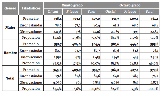 Por sector, los colegios privados alcanzaron en promedio 64,9 puntos más que los públicos. En los colegios privados, las niñas tanto en cuarto grado como en octavo alcanzaron cerca de 55 puntos de diferencia promedio a favor, respecto a sus homólogas de los colegios públicos. Los niños de las instituciones privadas de cuarto grado alcanzaron un diferencial a favor de 73 puntos, mientras que en octavo la brecha fue de 60 puntos, en promedio.