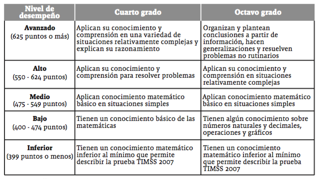 La prueba TIMSS identifica cuatro puntos en la escala global de matemáticas que sirven de comparación en los estándares internacionales; los valores 625, 550, 475, y 400 definen respectivamente los intervalos correspondientes a los niveles de desempeño: avanzado, alto, intermedio y bajo. Los puntajes por debajo de 400 definen otra categoría llamada inferior. La tabla 2 presenta la definición general que establece en cada nivel, lo que saben y deben hacer los estudiantes en un contexto determinado.
