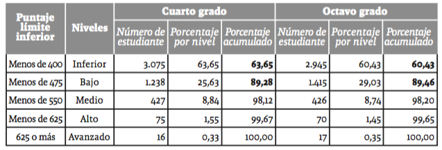 La tabla 3 muestra el desempeño medio en la prueba de matemáticas de los estudiantes colombianos de cuarto y octavo grados. La parte negativa de los resultados es que más de 60% de los estudiantes evaluados de ambos grados presentan un nivel de conocimiento matemático inferior al mínimo descrito en la prueba TIMSS, y que 25,63% en cuarto grado y 29% en octavo apenas alcanzan un conocimiento básico. En los niveles medio, alto y avanzado, tanto en cuarto como en octavo, solo se ubica un poco más de 10% de los estudiantes, donde 8,8% aplica solo conocimientos matemáticos básicos en situaciones simples, 1,5% lo aplica en situaciones relativamente complejas y el restante 0,33% (en cuarto) y 0,35% (en octavo) los utilizan en situaciones complejas.