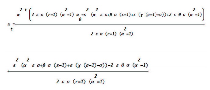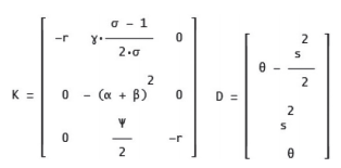 Cada uno de los dos regímenes se define por un sistema recursivo (m2t , Δt ) que puede expresarse en forma matricial con soluciones particulares: (I+K)-1 *D. La matriz I es la identidad, K la matriz de coeficientes y D la matriz de términos exógenos que en este caso incluye las condiciones iniciales. Para la sociedad heterogénea las expresiones son: