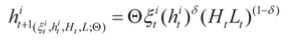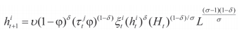 El capital humano de los hijos depende del capital humano de sus padres, de la fracción de tiempo que estos dedican a la crianza, de los gastos en escolaridad formal que puede ser financiada con fondos locales o privados, a través de impuestos o fondos propios provenientes de sus ingresos o con recursos nacionales que proceden del sector público. Así mismo, depende del índice global de la economía que intenta captar los efectos de complementariedad en cada área metropolitana. Finalmente, el capital humano de la descendencia también está determinado por un shock estocástico que indica el talento innato o el market luck, que se supone idéntica e independientemente distribuido.