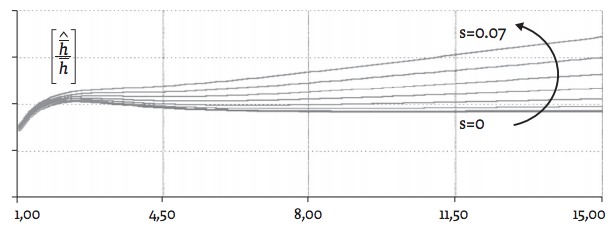 Fuente: elaboración propia.Un segundo ejercicio de simulación muestra que cuando se introduce algún grado de desigualdad inicial, s2 > 0 (individuos heterogéneos en la dotación inicial de talentos), el crecimiento de la economía centralizada excede el crecimiento de largo plazo de la economía descentralizada, tal y como se puede ver en las gráficas 3 y 4. Se aprecia que la ratio aumenta, indicando así que la evolución de la dotación media de capital humano del primer régimen de financiación de los servicios educativos supera los valores del segundo. Este resultado deja ver las posibles consecuencias negativas de largo plazo que tienen la segregación residencial, el sorting y los regímenes de financiación descentralizada en el largo plazo cuando los agentes tienen condiciones iniciales disímiles y prevalecen niveles elevados de desigualdad.