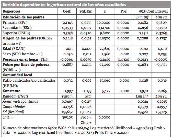 Las estimaciones efectivamente muestran que la educación de los padres desempeña un rol importante en el proceso de acumulación de capital humano de los hijos, los impactos diferenciales estimados mediante los coeficientes de primaria, secundaria y superior resultaron estadísticamente significativos. El origen urbano o rural de los padres también resultó significativo y con un impacto diferencial de los primeros relativamente alto.