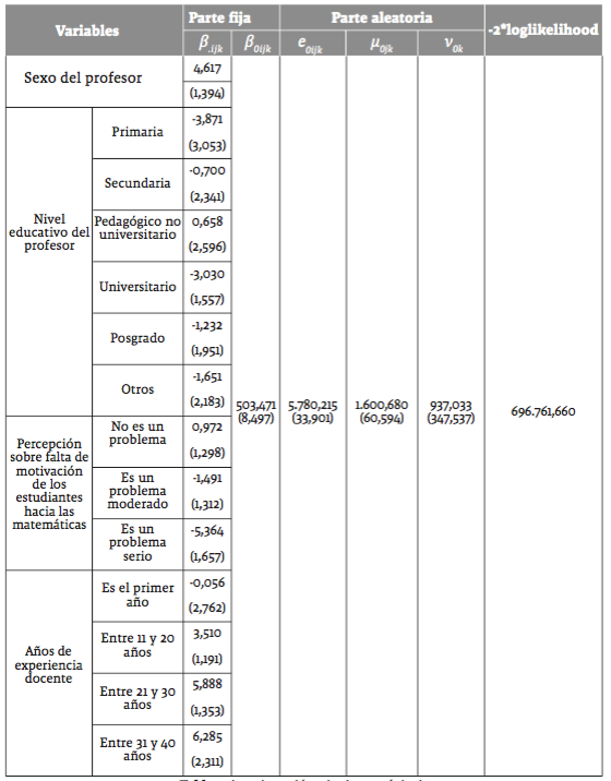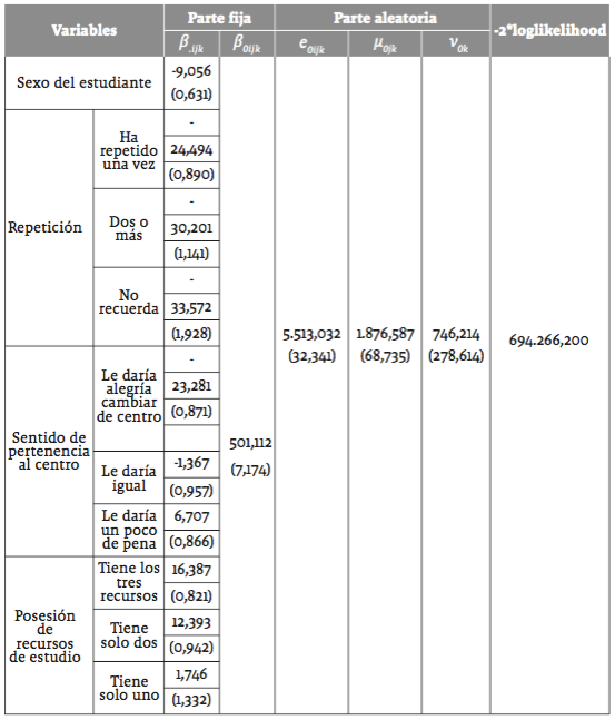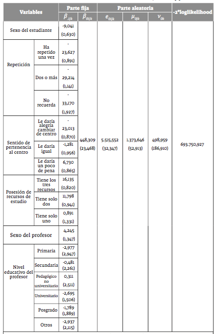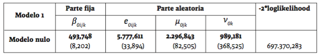 En la tabla 2, el valor β0ijk=493,748 es el punto de corte del modelo nulo, es decir, la calificación promedio en matemáticas obtenida por los estudiantes en las pruebas SERCE 2006, con un error típico de 8,202.
