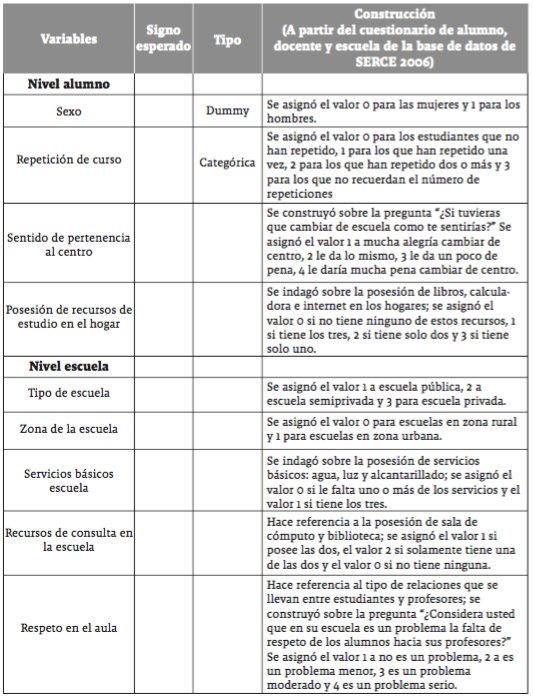Aunque las pruebas SERCE 2006 cuentan con una gran batería de preguntas sobre los centros educativos, profesores y estudiantes, en este estudio solo se incluyen variables asociadas a tercer grado de educación básica primaria que aparecen como relevantes en la mayoría de artículos sobre calidad de educación y que enfrentan variables de los tres niveles. Es de resaltar que la base de datos para este grado no presenta una variable específica que muestre el índice socioeconómico del estudiante, por tal razón se pretende usar como una proxy del nivel socioeconómico del estudiante la variable de recursos de estudio en el hogar, sin descartar la existencia de algún tipo de sesgo. Siguiendo la línea de Unesco (2008), para evaluar el clima escolar se usan los efectos de las variables sentido de pertenencia al centro de estudios y respeto en el aula; otras variables a considerar son: sexo del estudiante, repetición de cursos, sexo del profesor, nivel máximo de educación alcanzado por el profesor, percepción sobre actitud hacia las matemáticas, experiencia docente, tipo de escuela, zona de la escuela, servicios básicos de la escuela, recursos de consulta en la escuela y el porcentaje del PIB invertido en educación como variables independientes. La variable educación de padres no es considerada para el grado tercero en el estudio SERCE 2006, razón por la cual no se incluye en este estudio. Como variable dependiente se trabajó el puntaje estándar final del estudiante en la prueba SERCE 2006. La descripción detallada de las variables a utilizar en el modelo se presenta en el anexo 1.