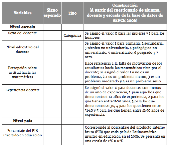 Cuando se considera el modelo de nivel país, donde únicamente se incluye la variable porcentaje de inversión del PIB en educación, se observa que esta única variable logra explicar 27,4% de la variación del nivel. Este es un resultado muy importante porque indica que la gran heterogeneidad observada en las puntuaciones para matemáticas en SERCE 2006 entre países (ρ = 0,067) puede ser explicada en gran parte por los recursos invertidos en educación.