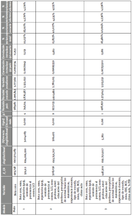 La inclusión de los tres grupos de variables logró que el coeficiente de correlación intraclase en comparación con el modelo nulo, en el nivel país disminuyera hasta 6,7% y en el nivel escuela a 18,6%, lo que indica el gran aporte a la explicación de la varianza entre países y escuelas. Cabe resaltar que las variables que más contribuyen son: tipo de escuela, zona, recursos de consulta, repetición de cursos, sentido de pertenencia al centro y porcentaje del PIB invertido en educación.