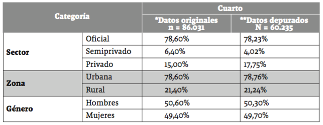 La muestra original sin los datos de Cuba y el estado de Nuevo León es de 86.031 estudiantes correspondientes a 2.500 escuelas en los 15 países. Es de anotar que debido a la existencia de valores omitidos en variables relevantes para el estudio fue necesario un proceso de depuración de los datos que finalmente arrojó una base de datos de 60.235 estudiantes correspondientes a 2.162 escuelas con los cuales se inició el procesamiento de información. En la tabla 1 se muestra que la distribución de las variables sector, zona y sexo de los estudiantes conservan una distribución similar a la de los datos originales.