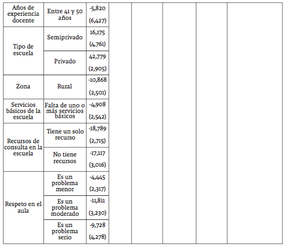 Con respecto a la variable nivel educativo del docente que tiene como referencia la categoría técnico no universitario, se presentó un resultado inesperado, puesto que los profesores con mayor nivel educativo presentan coeficientes negativos, lo que indica que a mayor nivel educativo del profesor, los estudiantes tienen menor puntaje en matemáticas en la prueba SERCE 2006. También se observa que el mayor aporte lo realizan los profesores con nivel educativo pedagógico no universitario. Según esto, se tienen fuertes implicaciones para fortalecer la formación pedagógica de los docentes en esta área.